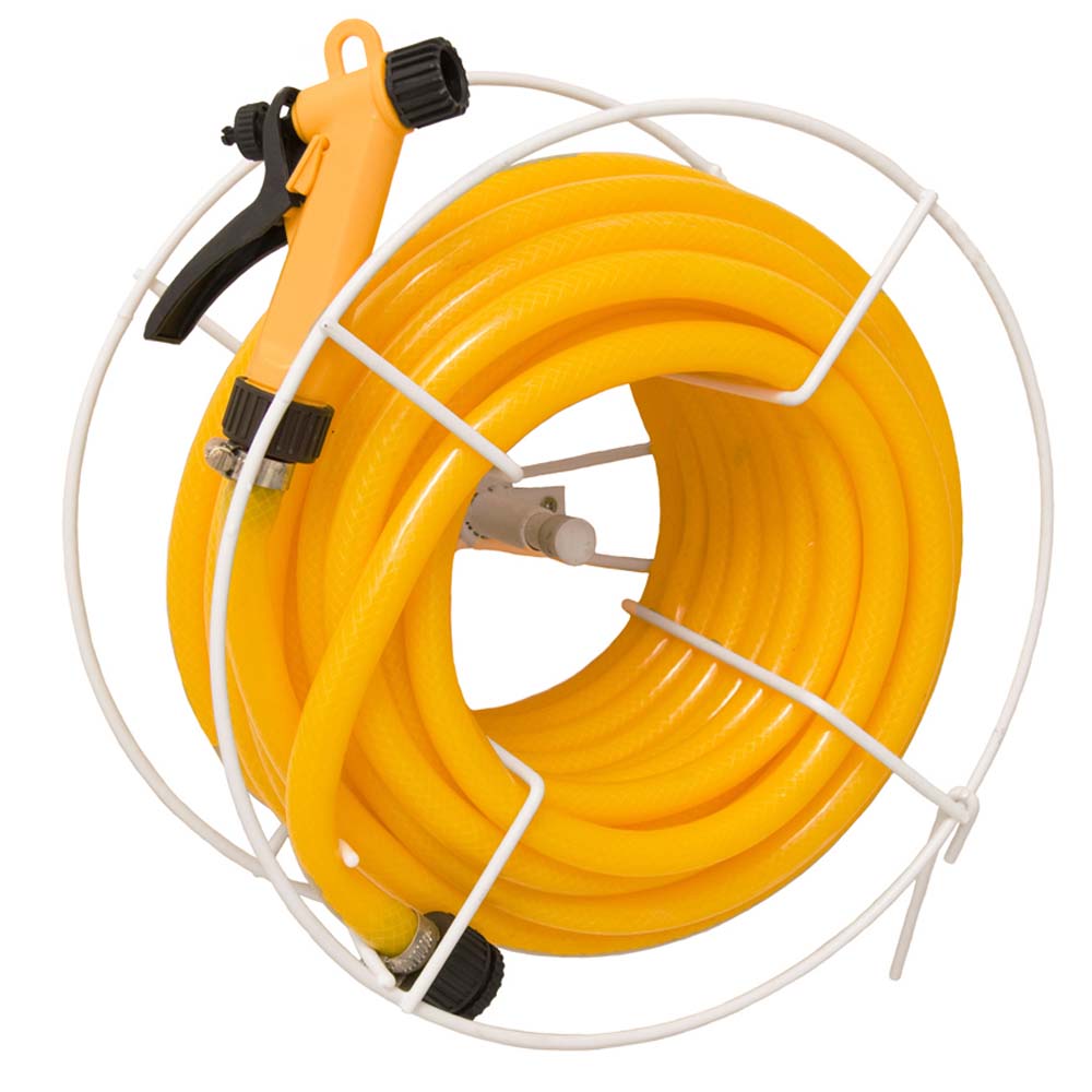 Detalhes: Enrolador de mangueira em aço de alta qualidade, ideal para tornar a experiência de regar o jardim mais eficiente e organizada. Com capacidade para até 30 metros de mangueira, este enrolador é robusto e durável.